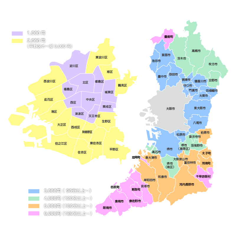 - 西成区・生野区・阿倍野区・西淀川区・東淀川区・旭区・此花区・港区・大正区・住之江区・住吉区・東住吉区・鶴見区・平野区(一部3,000円)